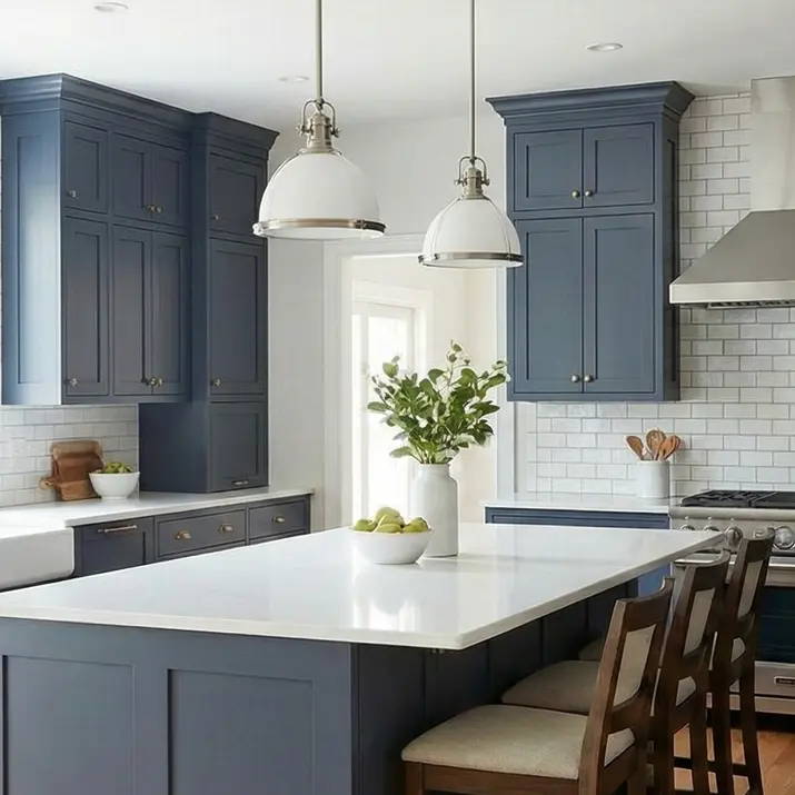 Our ProShaker Alpine Blue cabinets echo the rhythm of Spain's southern coast, blending a dark costal color, light, and an inviting seaside atmosphere.