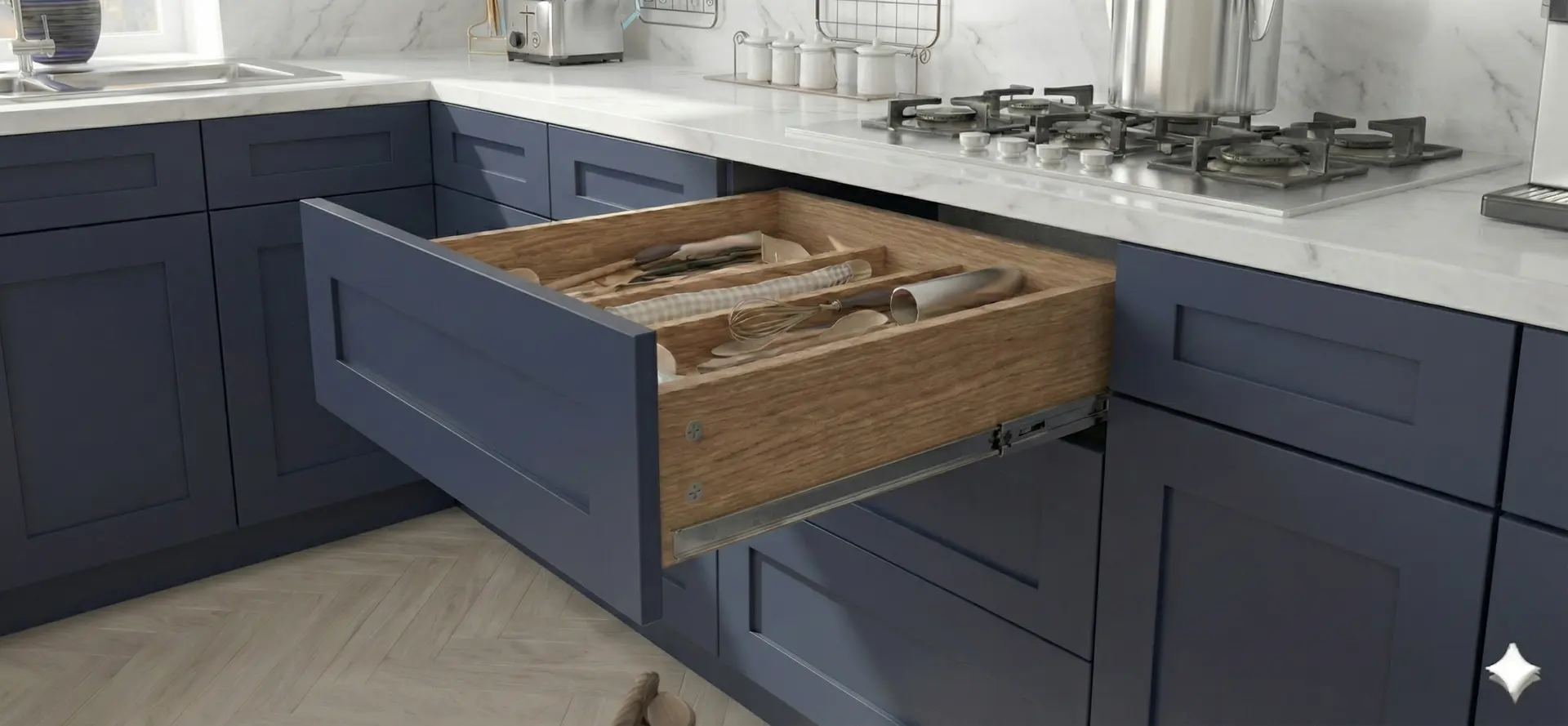 > Features full-extension under-mount drawer glides